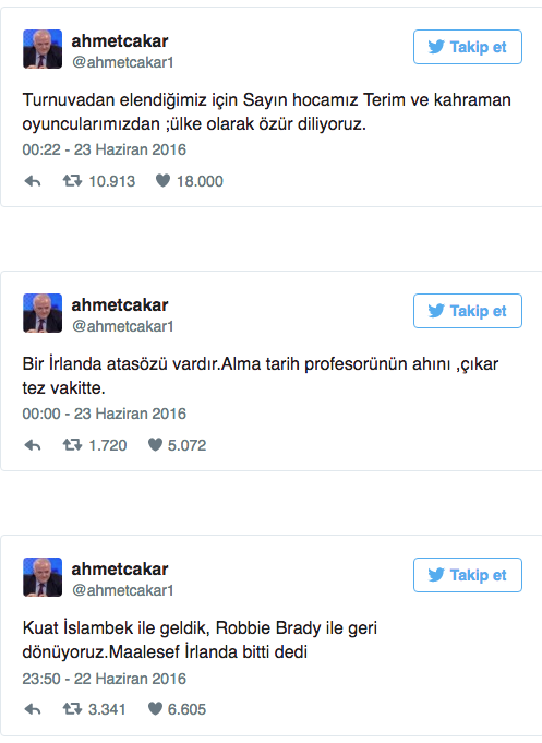 İtalya-İrlanda Cumhuriyeti karşılaşmasının ardından peş peşe tweetler atan Ahmet Çakar, Fatih Terim ve oyuncuları için ilginç ifadeler kullandı.