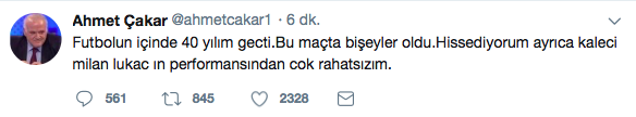 Galatasaray'ın maçı kazanmasının ardından ise Ahmet Çakar şu tweeti paylaştı..