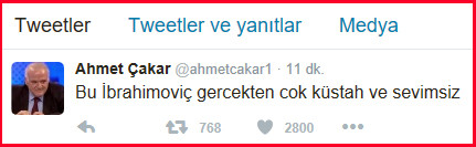 Ahmet Çakar, twitter'dan "Bu Ibrahimovic gerçekten çok küstah ve sevimsiz" cümlesi kurdu. Çakar'ın bu paylaşımı, binlerce takipçisi tarafından Retwit edildi.