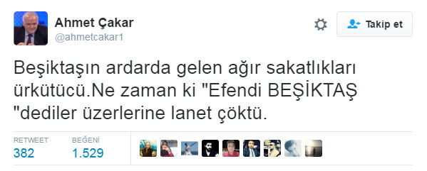 Eski hakem Ahmet Çakar, siyah beyazlı kulüpten peş peşe sakatlık haberlerinin gelmesinin ardından Twitter hesabından "Beşiktaşın ardarda gelen ağır sakatlıkları ürkütücü. Ne zaman ki "Efendi BEŞİKTAŞ "dediler üzerlerine lanet çöktü." paylaşımını yaptı.