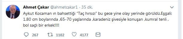 Aykut Kocaman ın bahsettiği “Taç hırsızı” bu gece yine olay yerinde görüldü.Eşgali: 1.80 cm boylarında ,65-70 yaşlarında ,karadeniz şivesiyle konuşan ,kumral tenli , bol saçlı bir erkek!!!!