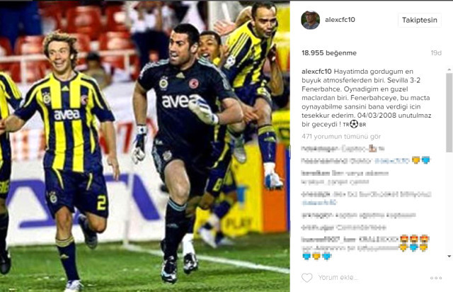 Alex, 2008 yılında bugün Sevilla karşısında oynadıkları bir karşılaşmadan kare yayınladı, Efsane oyuncu paylaşımına, "Hayatimda gordugum en buyuk atmosferlerden biri. Sevilla 3-2 Fenerbahce. Oynadigim en guzel maclardan biri. Fenerbahceye, bu macta oynayabilme sansini bana verdigi icin tesekkur ederim. 04/03/2008 unutulmaz bir geceydi!" notunu düştü.
