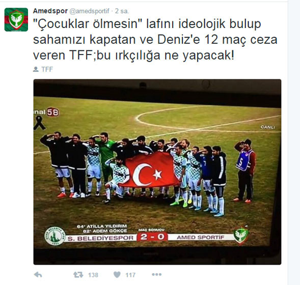 Tartışma bu kez maç sonuna taşındı. Amed Sporif Faaliyetler, resmi twitter hesabından paylaştığı bir fotoğrafta ırkçılık yapıldığını iddia ederek "''Çocuklar ölmesin" lafını ideolojik bulup sahamızı kapatan ve Deniz'e 12 maç ceza veren TFF; bu ırkçılığa ne yapacak!" yazdı.