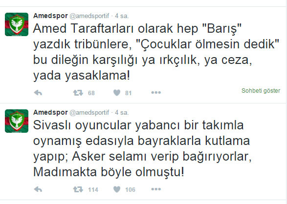 Bu tweetle yetinmeyen Amed Sportif yönetimi ayrıca Amed Taraftarları olarak hep "Barış" yazdık tribünlere, "Çocuklar ölmesin dedik" bu dileğin karşılığı ''ya ırkçılık, ya ceza, yada yasaklama!" ve "Sivaslı oyuncular yabancı bir takımla oynamış edasıyla bayraklarla kutlama yapıp; Asker selamı verip bağırıyorlar, Madımakta böyle olmuştu!" şeklinde iki ayrı tweet daha attı..