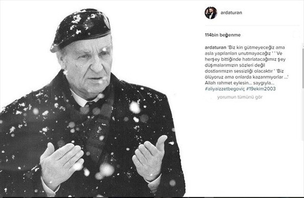 Arda, 19 Ekim 2003'te hayata gözlerini yuman Bosna Hersek'in ilk Cumhurbaşkanı Aliya İzzetbegoviç'in ölüm yıldönümü nedeniyle yaptığı paylaşımda, İzzetbegoviç'in "Biz kin gütmeyeceğiz ama asla yapılanları unutmayacağız. Ve her şey bittiğinde hatırlatacağımız şey düşmanlarımızın sözleri değil, dostlarımızın sessizliği olacaktır. Biz ölüyoruz ama onlar da kazanmıyorlar" mesajını paylaşması çeşitli yorumlara neden oldu.