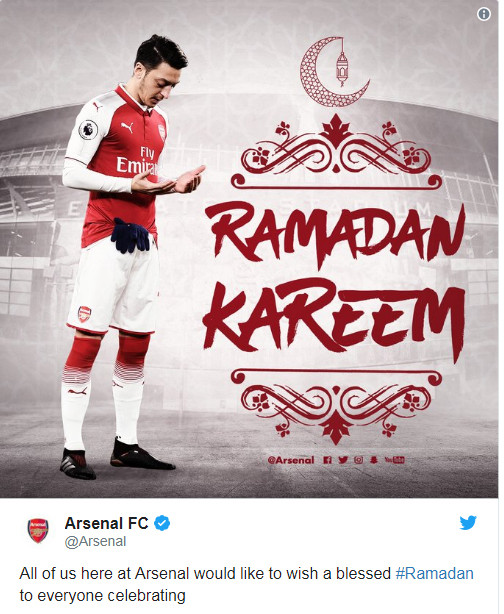 Resmi Twitter hesabından Mesut Özil'in dua ederken çekilmiş fotoğrafını paylaşan Arsenal Kulübü, yanına "Hayırlı Ramazanlar" anlamına gelen "Ramadan Kareem" notunu düştü.
