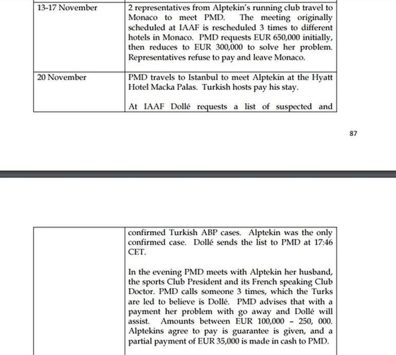 Buna göre Papa ilk olarak Alptekin’in kulüp temsilcileriyle 13-17 Kasım 2012’de Monaco’da görüştü. Dopingin örtbas edilmesi için Alptekin’den 650 bin Euro istedi, ancak daha sonra bu miktarı 300 bin Euro’ya kadar düşürdü. Kulüp temsilcileri ödeme yapmayı reddetti.
