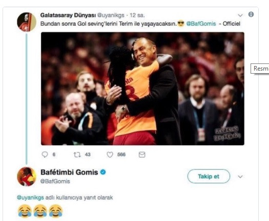 Twitter’da Igor Tudor ile gol sevincine photoshop ile Fatih Terim’in kafasını koyup fotoğrafı paylaşan ve ‘Bundan sonra gol sevinçlerini Terim ile yaşayacaksın’ yazan bir taraftara Gomis gülerek cevap verdi.
