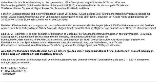 "Beşiktaş taraftarları takımlarının geçen sezon oynanan UEFA Avrupa Ligi müsabakası öncesinde Lyon kulübü taraftarlarına büyük bir şiddetle saldırdı. Bundan dolayı 20 Şubat 2018 tarihinde Allianz Arena'da oynanacak Bayern Münih-Beşiktaş maçında tüm seyirciler için çok sıkı güvenlik kontrolleri uygulanacaktır"