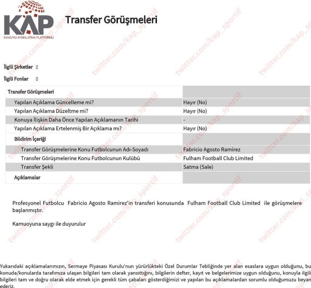 “Profesyonel Futbolcu Fabricio Agosto Ramirez’in transferi konusunda Fulham Football Club Limited ile görüşmelere başlanmıştır. Kamuoyuna saygı ile duyurulur”