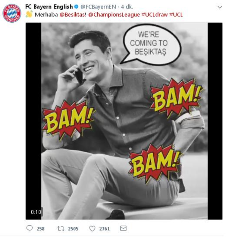 Bayern hesabı hemen ardından Beşiktaş'ın sezon başında yeni transferlerini duyurduğu 'Come To Beşiktaş' videolarına da göndermede bulunan Bayern Münih, "We are coming to Beşiktaş" (Beşiktaş'a geliyoruz) diyerek golcü futbolcu Lewandovski'nin fotoğrafını paylaştı. Görselde 'Bam Bam Bam' yazıları yer aldı.