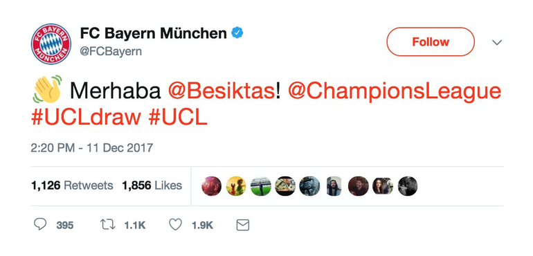 Kura çekiminin hemen ardından Bayern Münih'in resmi twitter hesabından önce Beşiktaş'ın twitter hesabına "Merhaba Beşiktaş" şeklinde bir mention yapıldı.