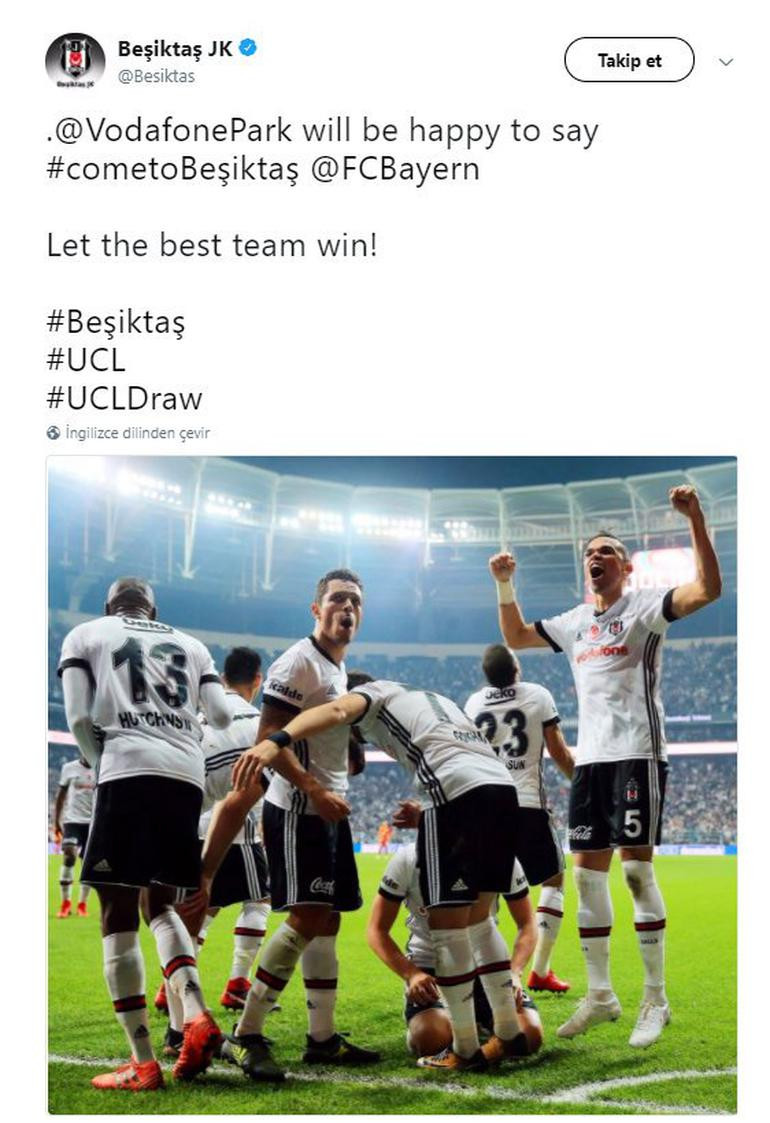Siyah beyazlılar da Bayern Münih'in paylaşımlarının ardından resmi Twitter hesabından "Vodafone Park, Bayern'e 'Come to Beşiktaş' demekten mutlu olacak. İyi olan kazansın."paylaşımı yaptı.