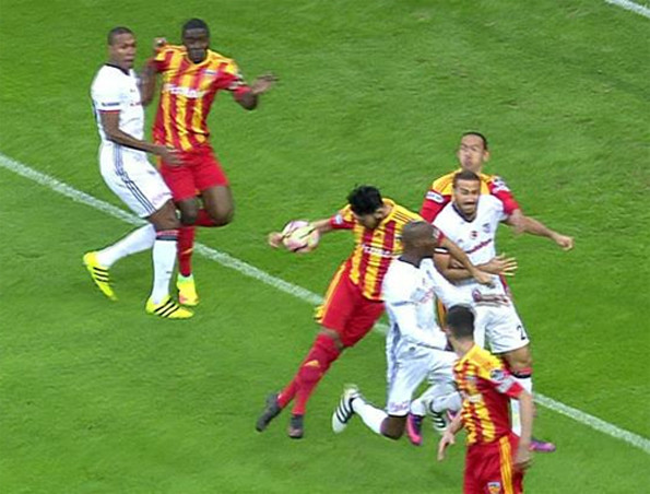 Siyah beyazlıların soldan kullandığı serbest vuruştu ceza sahası içerisine yönelen top Kayserisporlu Levent Gülen'in eline çarptı.
