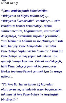 Oysa; Fenerbahçe Trabzonspor için güçlü amaçları oluşturan esin kaynağı aslında. Trabzonsporlular şiddet ortamı yaratmak yerine, kendi hedeflerine ulaşmak için yönünü değiştirmeli. kavga ve gerilim sahnelerinde rol almak yerine, haklı galibiyet elde etmek için, ışıklı bir yola neşe vermeli.