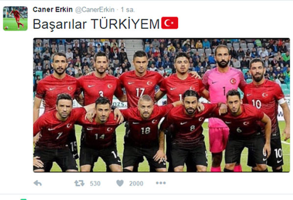 Bir diğer kadroya alınmayan isim Caner Erkin de kendisine ait Twitter adresinden "Başarılar Türkiyem" mesajını paylaştı.