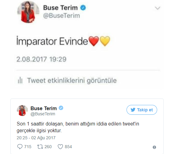 Fatih TErim'in kızı Buse Terim'in attığı iddia edilen 'İmparator evinde' tweeti kısa süre içinde Galatasaray taraftarı tarafından paylaşıldı.