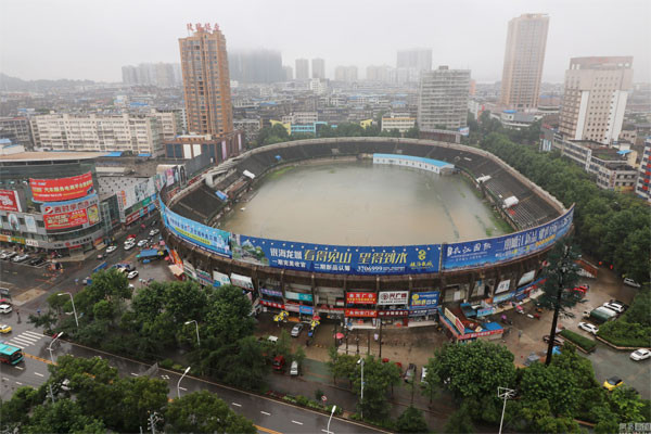 Çin'in Erzhou kentindeki stadyum, bölgeyi vuran yoğun yağmurun ardından, neredeyse ağzına kadar suyla doldu.