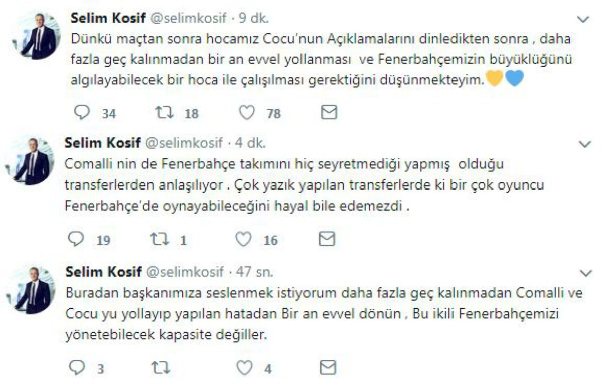 "Dünkü maçtan sonra hocamız Cocu’nun açıklamalarını dinledikten sonra daha fazla geç kalınmadan bir an evvel yollanması ve Fenerbahçe'mizin büyüklüğünü algılayabilecek bir hoca ile çalışılması gerektiğini düşünmekteyim.