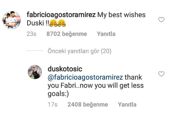 Sırp futbolcunun Siyah Beyazlılar'a veda ettiği paylaşımın altına yorum bırakan Fabri, eski takım arkadaşına "En iyi dileklerim seninle Duski!" mesajını göndermişti.