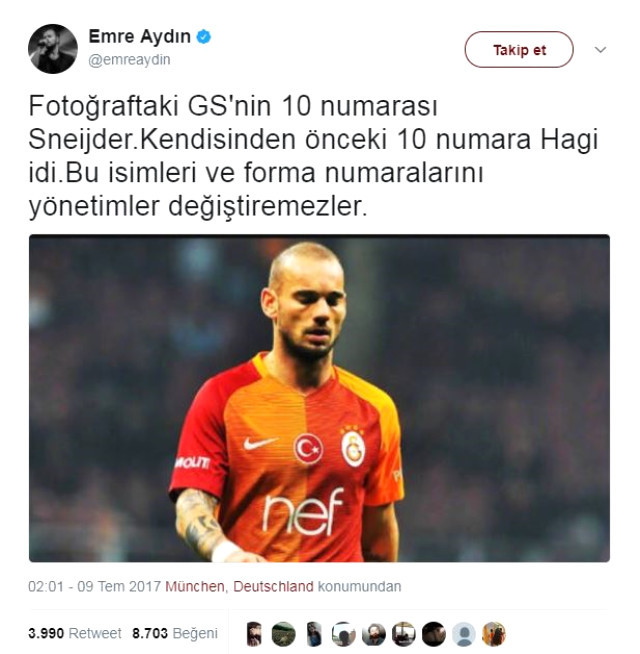 Fotoğraftaki Galatasaray'ın 10 numarası Sneijder. Kendisinden önceki 10 numara Hagi idi. Bu isimleri ve forma numaralarını yönetimler değiştiremezler.