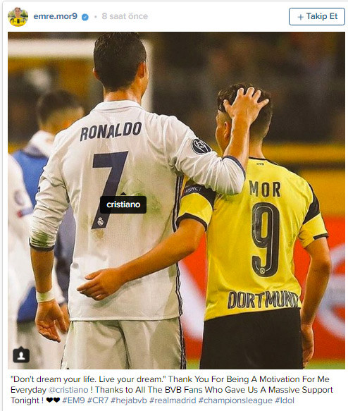 Real Madrid'in süperstarı Cristiano Ronaldo ile maç sonunda sarılmalarının fotoğrafını, kendisine ait instagram hesabından paylaşan Emre Mor, "Hayal kurma, hayalini yaşa. Her gün motivasyonum olduğun için teşekkürler Cristiano! Tüm BVB taraftarlarına, bana verdikleri büyük destek için teşekkür ediyorum." gönderimini yaptı.