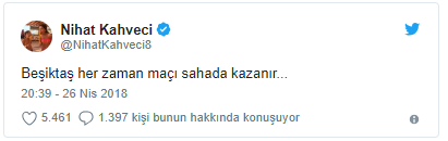 Beşiktaş, 3 Mayıs'ta Fenerbahçe'yle oynaması gereken Ziraat Türkiye Kupası yarı final rövanşına çıkmama kararı verdi. Tarihi karar sonrası Siyah Beyazlıların eski futbolcularından Nihat Kahveci, resmi Twitter hesabından bir mesaj yayımladı.