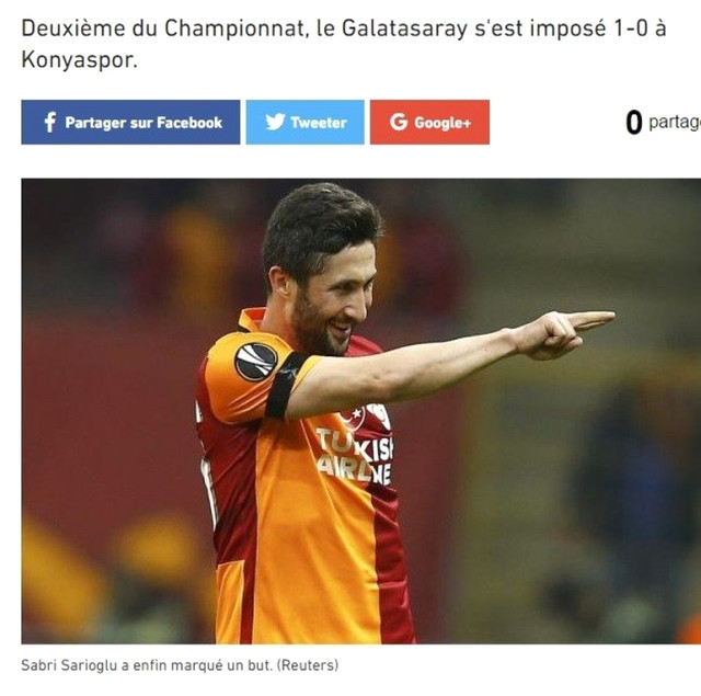 Öte yandan Galatasaray'ın, Atiker Konyaspor galibiyeti ve Sabri'nin golü Fransa'nın ünlü gazetesi L'Equipe'te de yer aldı. Söz konusu haberde Galatasaray'ın tek golle kazandığı yazılırken, Sabri'nin attığı golün Galatasaray'a şampiyonluk yolunda ilaç olduğu ifadelerine yer verildi.