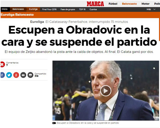 Spor Toto Basketbol Ligi Play-off yarı final serisinin 3. maçında Galatasaray Odeabank'a Abdi İpekçi Spor Salon'unda 65-63 yenilen Fenerbahçe'nin başantrenörü Obradoviç'in ayranlı saldırıya uğraması İspanya'nın ünlü gazetesi Marca'da da manşet oldu.