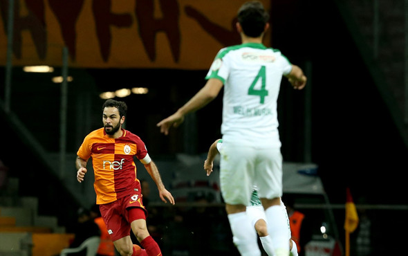 18. dakika: Selçuk İnan'ın pasında ceza sahası ön tarafında kaleyi cepheden gören bir noktada topla buluşan Sofiane Feghouli'nin vuruşu Sivas Belediyespor defansına çarparak uzaklaşıyor.