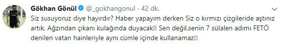 Sosyal medya hesabından bir açıklama yapan Gökhan Gönül, ‘Siz susuyoruz diye hayırdır? Haber yapayım derken Siz o kırmızı çizgileri de aştınız artık. Ağzından çıkanı kulağında duyacak!! Sen değil,senin 7 sülalen adımı FETÖ denilen vatan hainleriyle aynı cümle içinde kullanamaz!!’ ifadelerini kullandı.