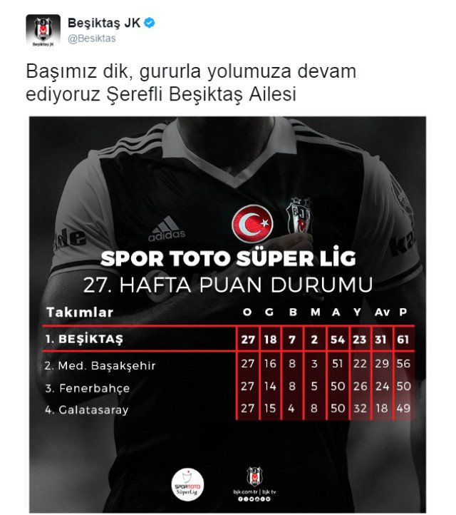 Bu paylaşımın ardından Beşiktaş da resmi Twitter hesabından Spor Toto Süper Lig'de ilk 4 takımın puan durumunun bulunduğu bir görsel paylaştı ve Galatasaray'ın dördüncülüğüne imada bulundu. Beşiktaş'ın bu paylaşımının bir sebebinin de Lyon maçından sonra demoralize olan taraftar ve futbolculara moral vermek olduğu öğrenildi.
