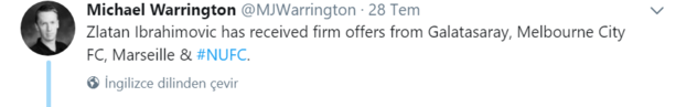 Warrington, Manchester United ile sözleşmesi sona eren ve bonservisi elinde bulunduran Zlatan Ibrahimovic'in Galatasaray'a transfer olabileceğini belirtti. İngiliz muhabir, İsveçli yıldız futbolcu için Galatasaray, Melbourne City, Marsilya ve Newcastle United'ın teklifte bulunduğunu iddia etti.