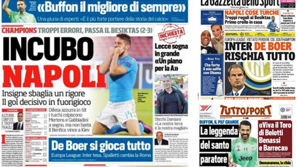 Tuttosport'un manşeti ise 'Napoli ve kabus' oldu. Beşiktaş, Napoli'yi 3-2 yenerek gruptaki puanını 5'e yükseltmiş ve 6 puanlı Napoli'nin ardından 2. sıraya yükselerek gruptan çıkma umutlarını taze tutmuştu.