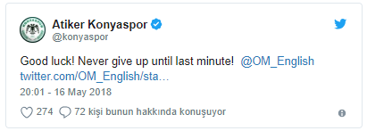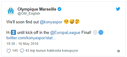 Marsilya’nın İngilizce paylaşım yapan resmi hesabı bu ‘tweet’i bugün maç öncesinde yeniden paylaşırken “Yakında göreceğiz Konyaspor. UEFA Avrupa Ligi Finali’ne iki saat kaldı” şeklinde bir paylaşımda bulundu. Bunun üzerine Konyaspor ise Marsilya’ya “Bol şanslar! Son dakikaya kadar asla pes etmeyin” yanıtını verdi.