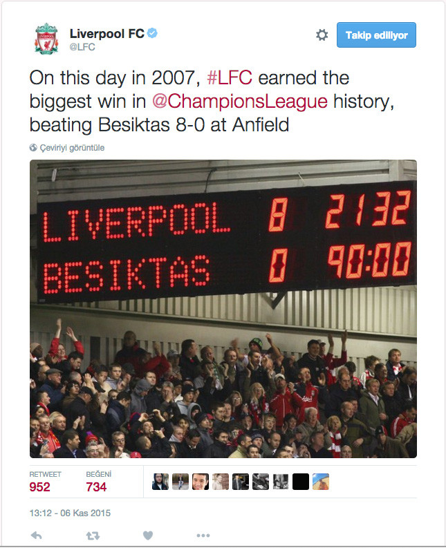 Twitter hesabından 6 Kasım 2007'de Anfield'da oynanan ve Liverpool'un Beşiktaş'ı 8-0 yendiği maçın son anlarındaki skor tabelasını paylaşan Liverpool Kulübü, resmin üstünde "2007'de bugün LFC, Beşiktaş'ı Anfiedl'da 8-0 yenerek, Şampiyonlar Ligi'ndeki en farklı galibiyeti elde etti" mesajını ekledi.
