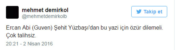 Demirkol, kişisel Twitter hesabından attığı tweet'te, "Ercan Abi (Guven) Şehit Yüzbaşı'dan bu yazi için özür dilemeli. Çok talihsiz" ifadesini kullandı.