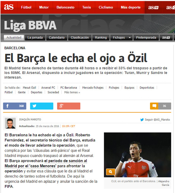 Jaoquin Morata imzalı haberde, Barcelona yöneticisi Roberto Fernandez , Mesut'u Barcelona'ya getirmek için operasyona başladı. Oyuncunun Londra'da artık mutsuz olduğu ve kupa kazanmak için başka bir takıma gitmek istediği belirtilirken hayalinin de yenidenLa Liga'ya dönmek olduğu vurgulandı. Haberde, Mesut'un Barcelona'nın kıskacına girmesine karşın bu transferde ciddi bir Real Madrid probleminin olduğu da vurgulandı.