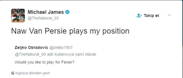 Mike James, kendisine yöneltilen, "Fenerbahçe'de oynar mısın?" sorusuna, "Şu an benim pozisyonumda Van Persie oynuyor." yanıtını verdi.