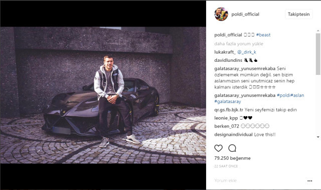 Yaklaşık 11 milyon TL değerindeki arabasıyla poz veren Alman yıldız Podolski, Instagram hesabından paylaştığı fotoğrafa "Canavar" notunu da ekledi.