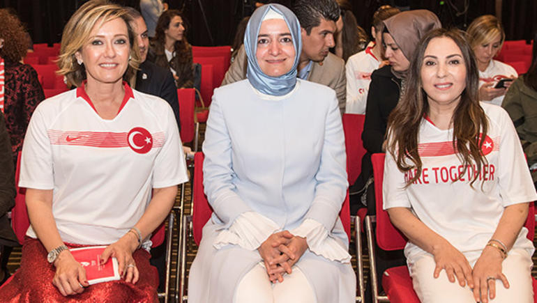İnanıyorum ki Türkiye'nin 2023 vizyonunu 2024'te UEFA Avrupa Futbol Şampiyonası'na ev sahipliği yaparak taçlandıracağız. Çünkü biz yıllar önce 2023 vizyonumuzu ortaya koyduk ve ülkemizi taşımak istediğimiz noktayı yıllar öncesinden hesaplayarak, planlayarak ortaya koyduk. Bir bir Allah'ın izniyle bu adımları gerçekleştiriyoruz. Biz ülkemizin her alanda daha güçlü hale gelmesini istiyoruz. Ülkemizde kadınların her alanda daha güçlü olmasını istiyoruz. Sporda, sanatta, eğitim hayatında seçme seçilme karar alma mekanizmalarında yer alma noktasında kadınların her alanda güçleneceği Türkiye için gece gündüz demeden çalışıyoruz. 2023 hedeflerine güçlü bir şekilde inanç azim ve kararlılıkla yürüyen Türkiye 2024'te de Avrupa Futbol Şampiyonası'na ev sahipliğini de kazanacaktır. Bunun için kadınlar olarak biz üstümüze düşeni yapmalıyız. Bugün olduğu gibi bu tür organizasyonlarla bunun duyurusuna toplumsal farkındalığının olmasına her birlikte katkı vereceğiz. 'Birlikte Paylaşalım' sloganı gerçekten çok güzel. Millet olarak birlikte, inançla yürüdüğümüz her yolda başarıyı yakalamış bir milletiz. Bu organizasyona da ev sahipliği anlamında da birlikte azim ve kararlılıkla paylaşmanın çok önemli olduğuna inanıyorum. Anadolu coğrafyası yüz yıllardır farklı kültürlere, farklı medeniyetlere ev sahipliği yapmış eşsiz bir coğrafya. Bin yıllık tarihimizde biz, din, dil, ırk ve köken ayrımı yapmaksızın insanlığın ortak değerlerini yaşattık ve yaşatmaya da devam edeceğiz. Dünyada herhalde tarihin inançların, doğal güzelliklerin, farklı kültürlerin bir arada bu kadar muhteşem bir ahenk içerisinde yaşadığı ender ülkelerden bir tanesiyiz. Bu şampiyonaya ev sahipliği yaparak, sahip olduğumuz bu zenginlikleri de dünya ile paylaşmaya da birlikte hazırız diye inanıyorum.