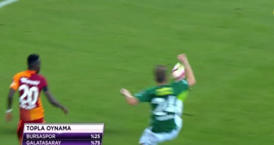 Hakem Halis Özkahya'nın düdük çaldığı maçın 28. dakikasında penaltı tartışması yaşandı. Gelişen Galatasaray atağında savunmanın arkasına atılan topta kayarak müdahale etmeye çalışan Bursasporlu Ertuğrul'un top eline çarpınca sarı kırmızılı futbolcular penaltı beklentisinde bulundu. Ancak maçın hakemi Halis Özkahya pozisyonu çarpma olarak değerlendirerek devam kararı verdi.