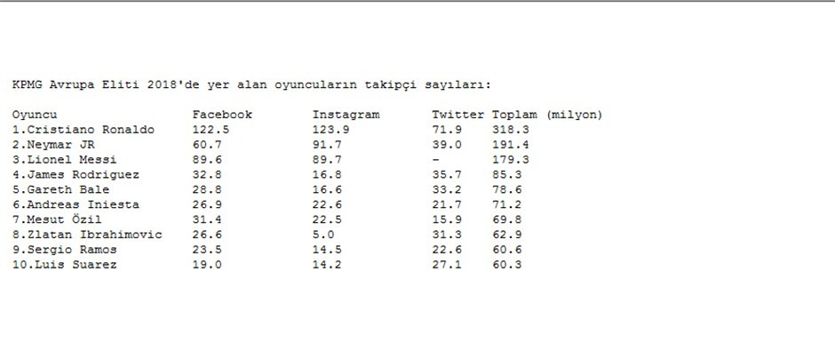 KPMG Football Benchmark Ekibi, 'Avrupa Eliti 2018' raporunda sosyal medyada en çok takipçisi olan 20 futbolcuyu inceledi.