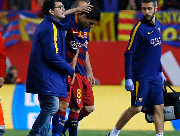 Barcelona'nın Sevilla ile oynadığı İspanya Kral Kupası yarı final maçında Luis Suarez arka adalesinden sakatlanarak oyundan çıktı. Rakibiyle çarpışan Lionel Messi'nin ise kafasında büyük şişlik oluştu.