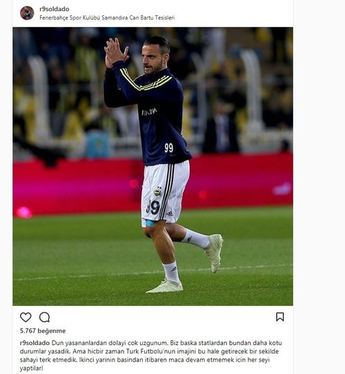 Soldado, Instagram'dan paylaştığı fotoğrafa "Dün yaşananlardan dolayı çok üzgünüm. Biz başka statlardan bundan daha kötü durumlar yaşadık. Ama hiçbir zaman Türk Futbolu'nun imajını bu hale getirecek bir şekilde sahayı terk etmedik. İkinci yarının başından itibaren maça devam etmemek için her şeyi yaptılar!" notunu düştü.
