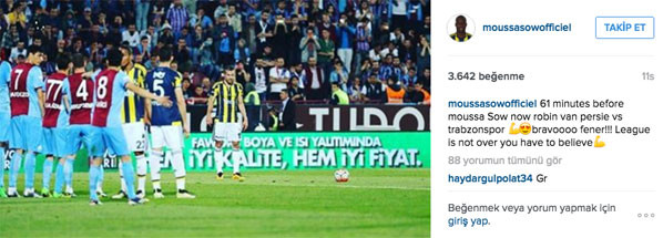 4-0 iken 89. dakikada taraftarların sahaya girmesiyle birlikte tatil edilen maçta, Robin Van Persie'nin frikikten 61. dakikada attığı gol üzerine Sow, sosyal medyada, "61. dakika önce Moussa Sow şimdi de Robin Van Persie. Bravo Fener! Lig daha bitmedi, inanmak zorundasınız" diye yazdı. Fenerbahçeli taraftarlar Sow'un bu mesajına yoğun ilgi gösterdi.