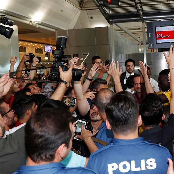 Gomis, bilet ve bagaj işlemlerinin ardından pasaport kontrolüne giderken, oluşan izdiham nedeniyle kendisini koruyan polisler zaman zaman zor anlar yaşadı.