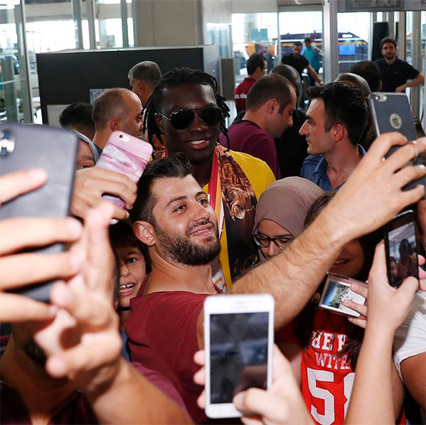 TARAFTARLARI GERİ ÇEVİRMEDİ : Sarı-kırmızı kıyafetler giyen ve Galatasaray atkısı taktığı görülen Fransız golcü, kendisiyle hatıra fotoğrafı çektirmek isteyenleri geri çevirmedi.