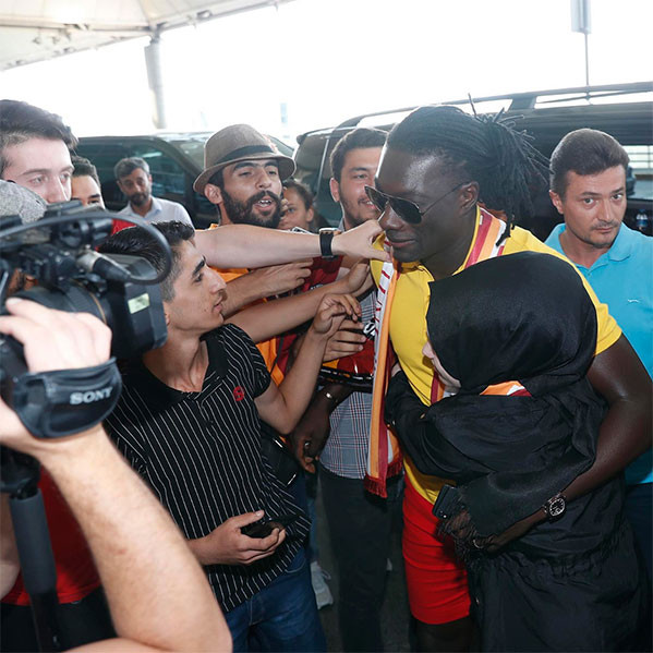 TARAFTARLARIN YOĞUN İLGİSİ VARDI : İstanbul Atatürk Havalimanı'na tezahüratlar eşliğinde gelen Bafetimbi Gomis, taraftarların sevgi gösterileri nedeniyle uzun süre bilet işlemleri için kontuar önünde bekledi.