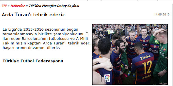 TFF'nin resmi internet sitesinden yayımlanan mesajda, "La Liga'da 2015-2016 sezonunun bugün tamamlanmasıyla birlikte şampiyonluğunu ilan eden Barcelona'nın futbolcusu ve A Milli Takımımızın kaptanı Arda Turan'ı tebrik eder, başarılarının devamını dileriz." ifadeleri kullanıldı.